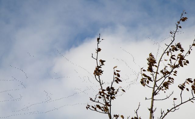 Deep inside the park, the cranes were having their giant meet-up in the sky. Hundreds, possibly thousands of the birds gathered and one group would meet another group and they’d rise together and circle. Another bunch would join and in the distance a group five times the size of the smaller group circled and rose and their soaring bodies gave shape to the air currents.