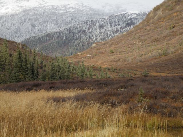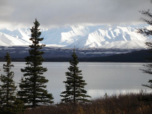 At the park entrance most of the foliage was gone from the shrubs and deciduous trees, the sky was gray and the air had a wool sweater edge to it. A short climb in elevation led us into snow flurries. A higher climb left us waiting to see if we could even make it to the end of the road for all the snow that had accumulated on the pass. Thankfully, the snowplows prevailed and we made it to Wonder Lake, where it felt less like winter and more like late autumn again.