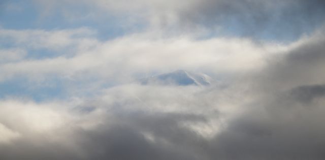 Near the end of the road, where the snow had gone and we found remnants of blueberries still hanging on their leafless branches and lingonberries bunched close to the ground, where the mountains made perfect reflections into the ponds and where overhead the cranes continued to call—the sun came out for a few minutes. The clouds gave way to bits of blue sky and for a moment the summit of Denali showed through. It didn’t last long.